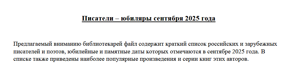Предлагаемый вниманию библиотекарей файл содержит краткий список российских и зарубежных писателей и поэтов, юбилейные и памятные даты которых отмечаются в сентябре 2025 года. В списке также приведены наиболее популярные произведения и серии книг этих авторов. (+ файл)