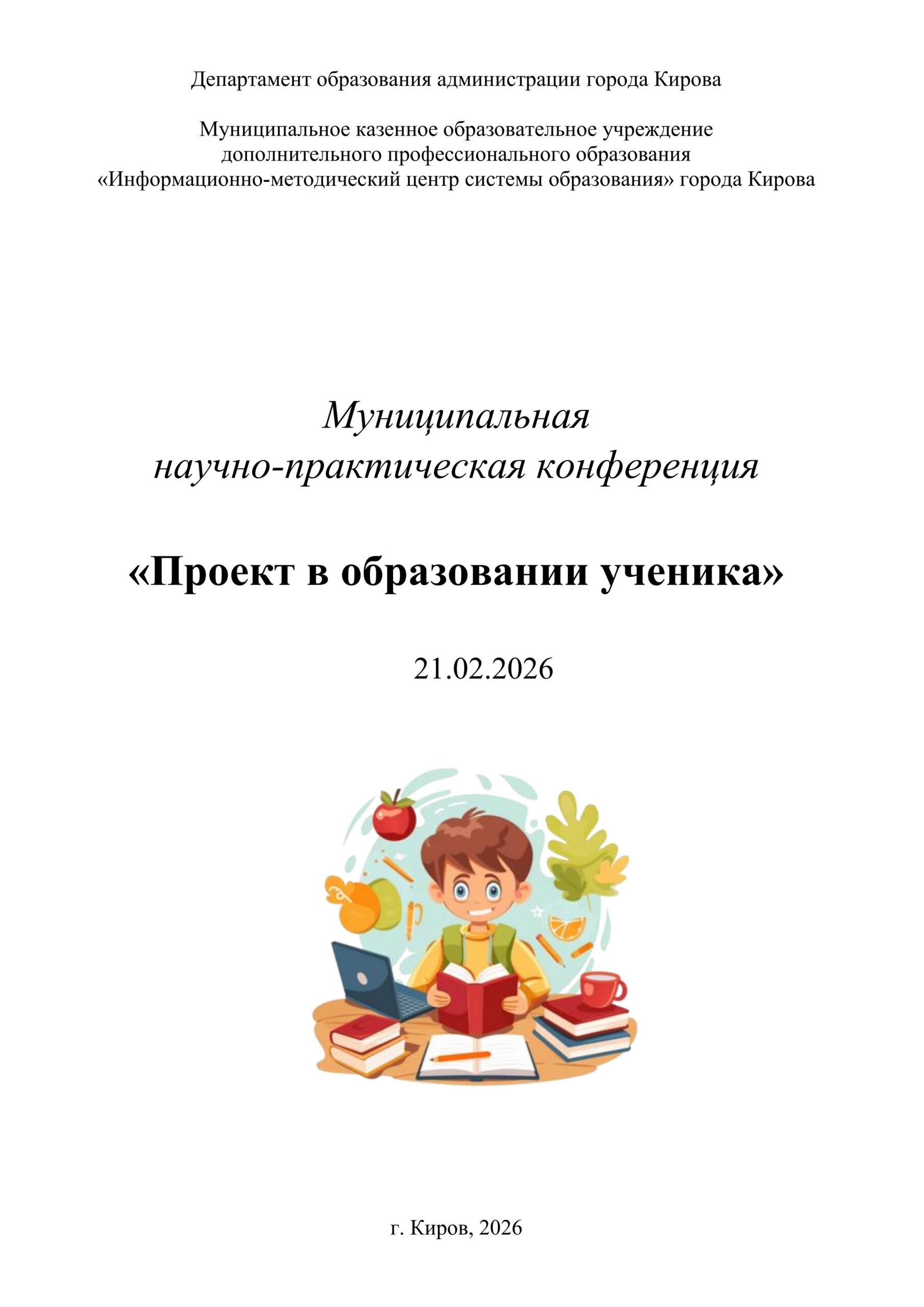 21 февраля 2026 года в МКОУ ДПО ИМЦ города Кирова (ул. Профсоюзная, 41а) состоится муниципальная научно-практическая конференция «Проект в образовании ученика». Предлагаем ознакомиться с программой научно-практической конференции.
