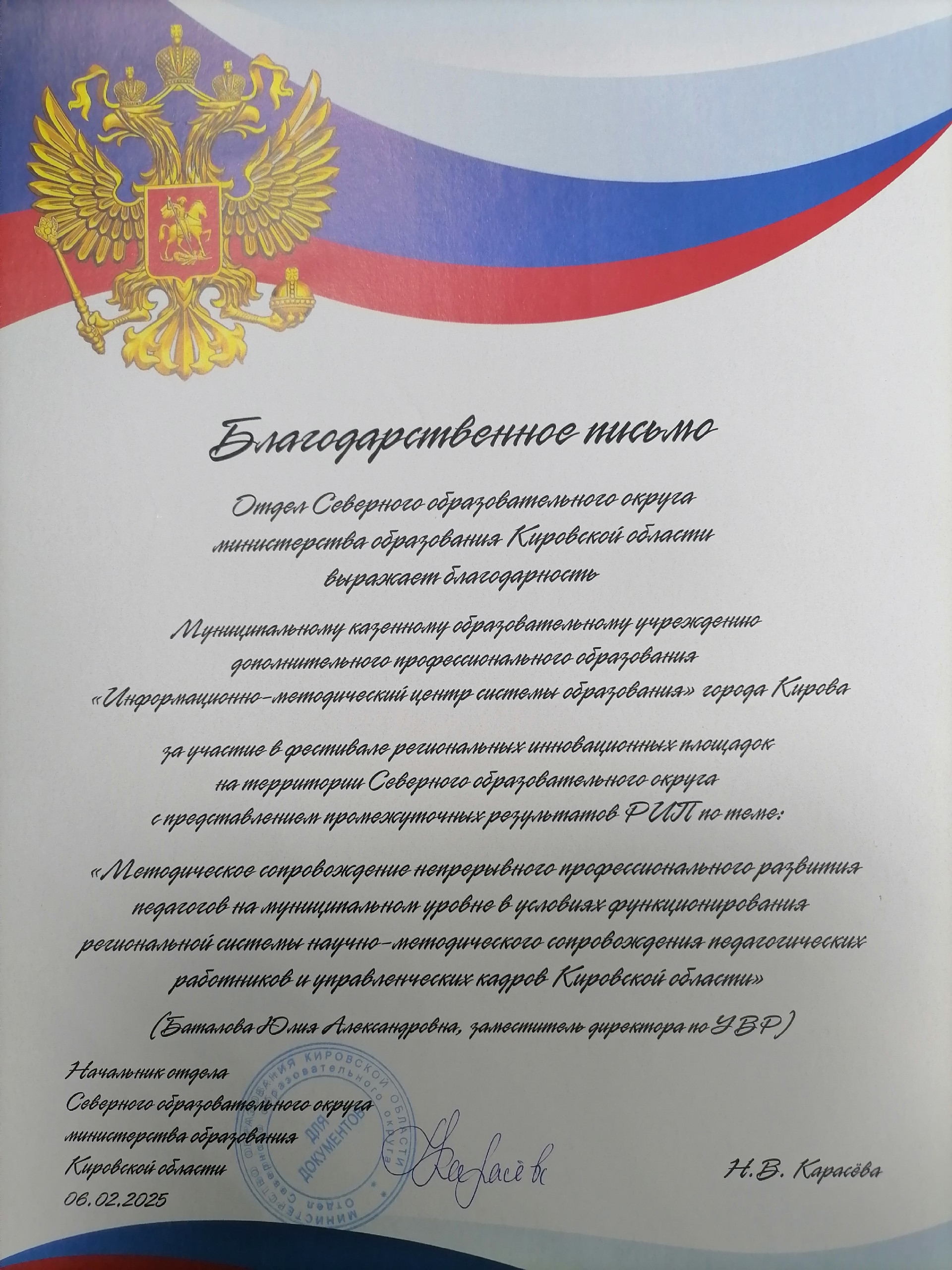 18.09.2025 года методисты муниципальных методических служб из двадцати муниципальных образований Кировской области посетили Информационно-методический центр. Гостям был представлен опыт работы нашего учреждения по методическому сопровождению педагогов муниципальных образовательных организаций города Кирова. Юлия Александровна Баталова, заместитель директора нашего Центра, рассказала также Читать далее …